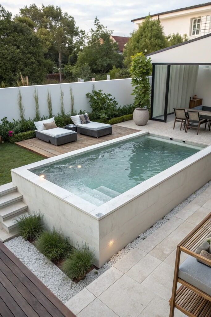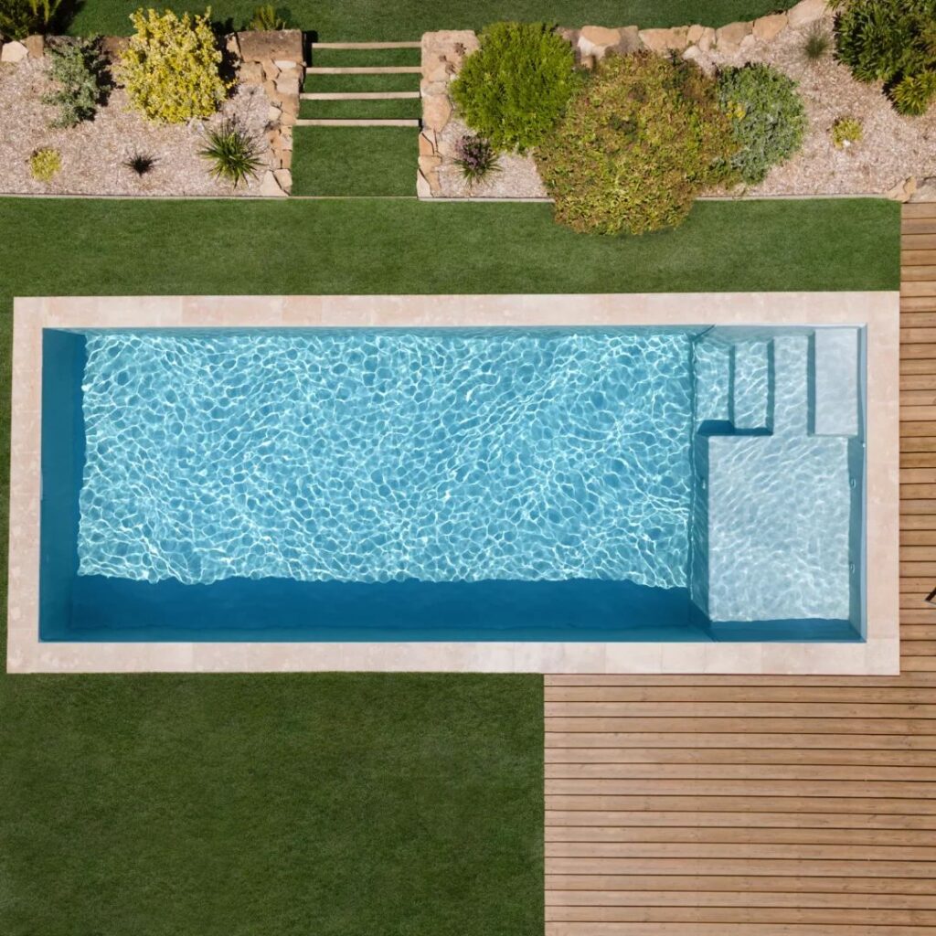 Safety and functionality are the priorities here. These designs often include a “Baja Ledge” or a wide sun shelf—a shallow area (about 20cm deep) where toddlers can splash safely or adults can place a sun lounger. These pools typically use non-slip tiles and ensure the deep end is clearly defined for older kids.