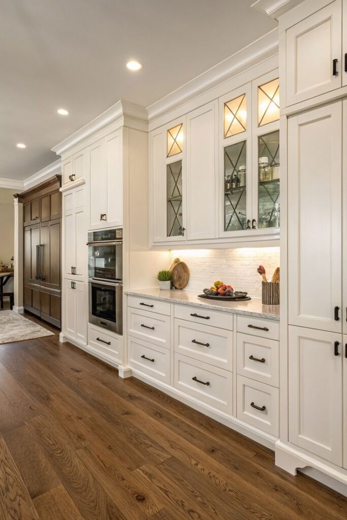 Glass-fronted kitchen cabinets are a designer’s secret weapon. They break up the “wall of wood” in a large kitchen, reflect natural light to make the space feel bigger, and allow you to showcase your most beautiful heirloom pieces.