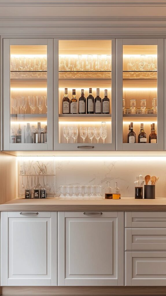 Even the most perfectly styled cabinet will look dull if it’s dark inside. Lighting is what transforms a cabinet from storage into a showcase.